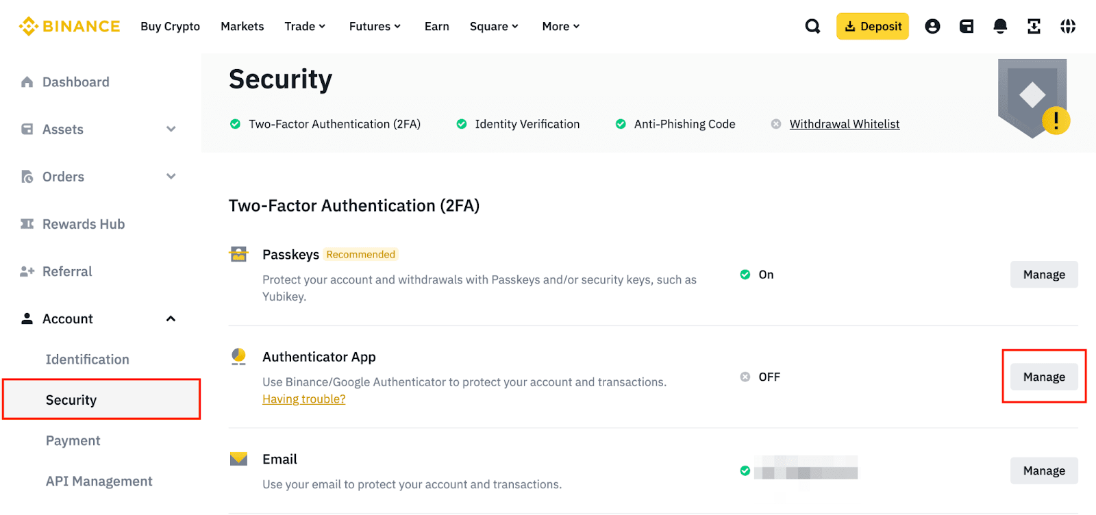 2. 进入“账户安全”选项,在“身份验证器App”旁边找到“管理”按钮,并点击它。