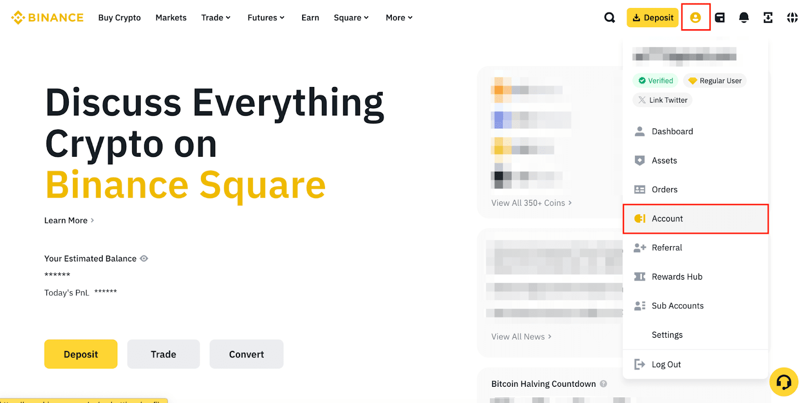 1. 登录您的币安账户,在【个人资料】图标上悬停鼠标,然后点击【账户】。