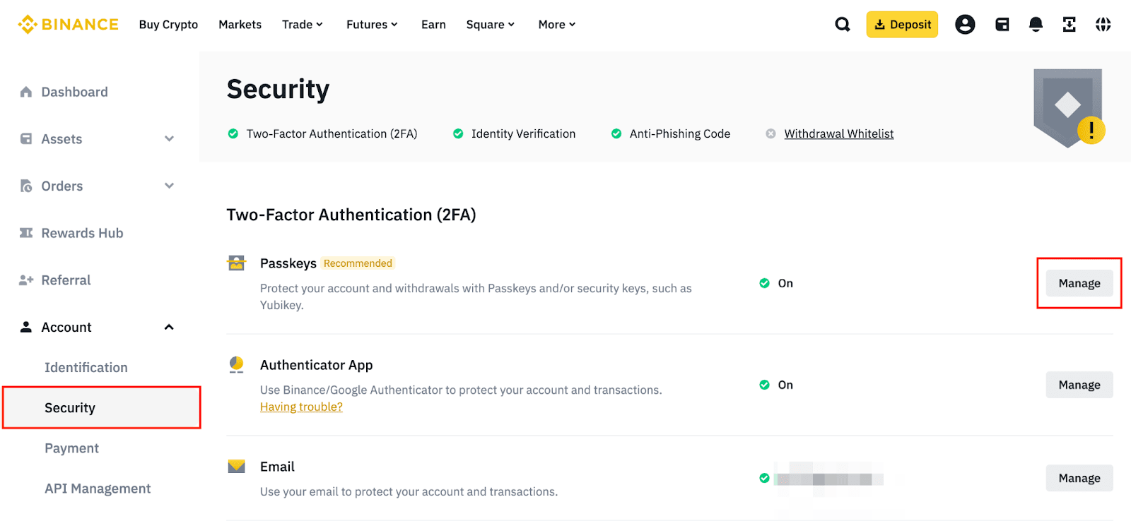 2. 前往【账户安全】,然后点击【通行密钥】旁边的【管理】。