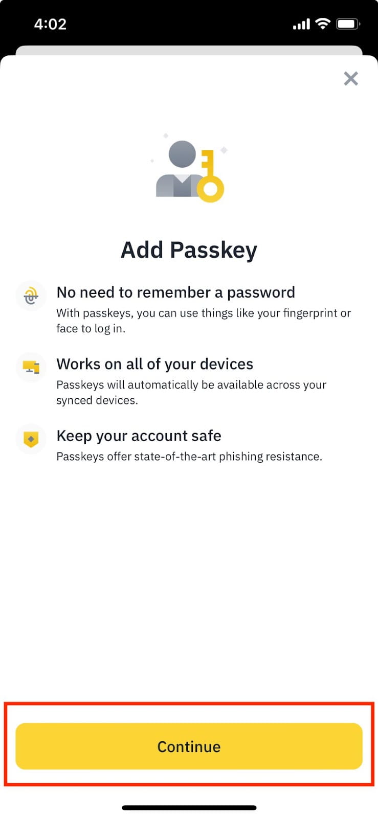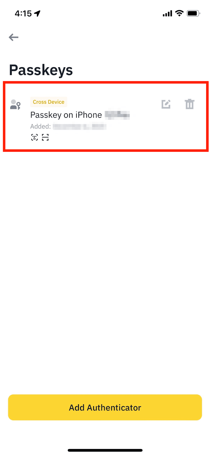 6. 您已成功将通行密钥添加至您的币安账户。请注意,创建的通行密钥仅保存在当前设备上。