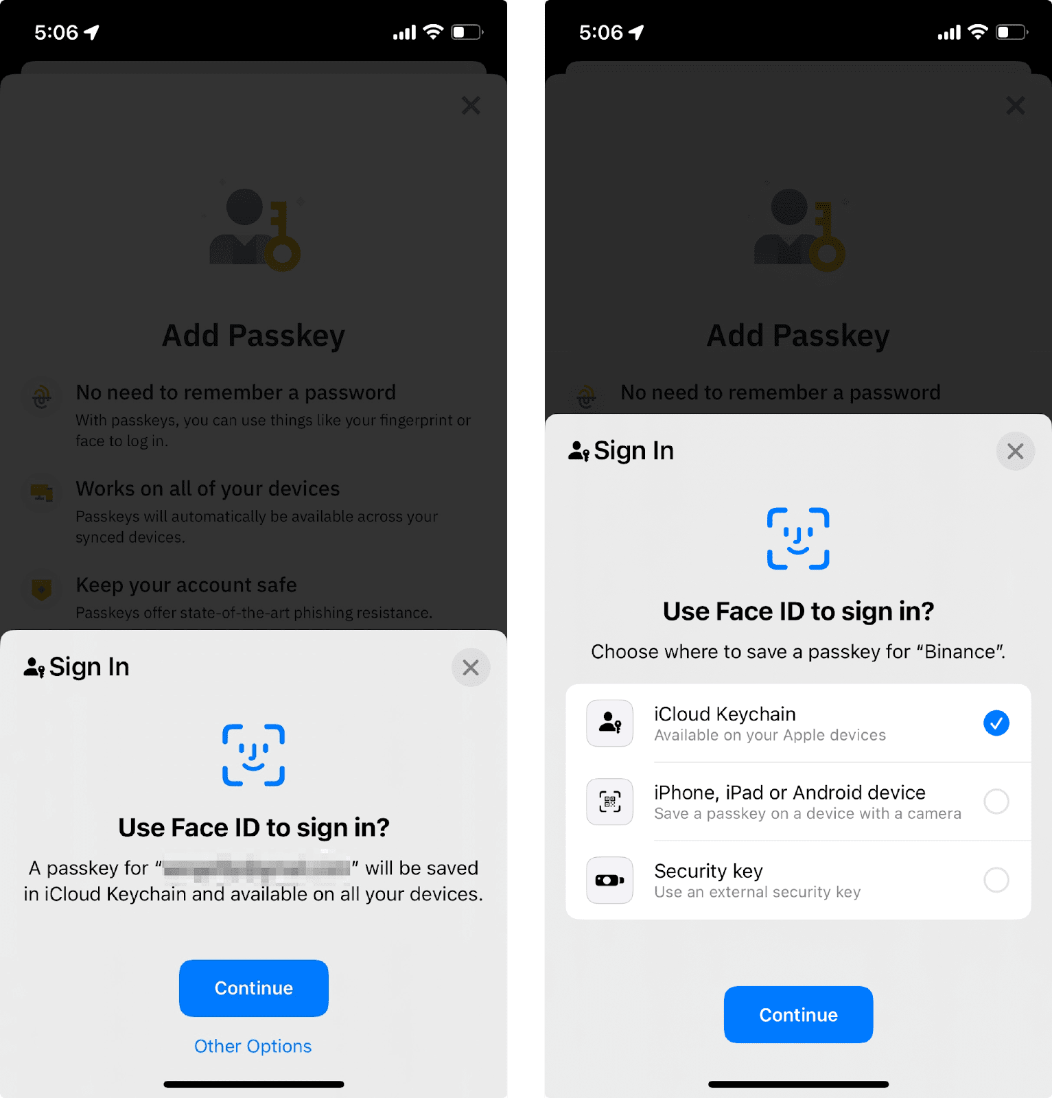 4. 在这一步会弹出一个窗口。请确认您的币安账户邮箱地址,然后点击【继续】并选择验证方式以创建通行密钥。