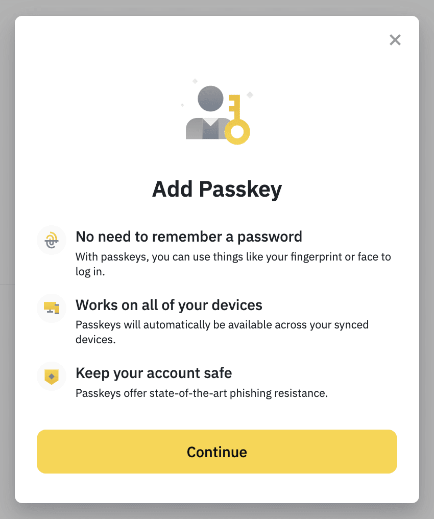 您可以使用支持此功能的浏览器,如最新版本的Chrome浏览器,向您的币安账户添加密钥。添加过程与在币安App上的操作类似。您可以使用电脑密码或生物识别验证(如指纹ID)、USB安全密钥或其他设备(如您的手机)来完成。